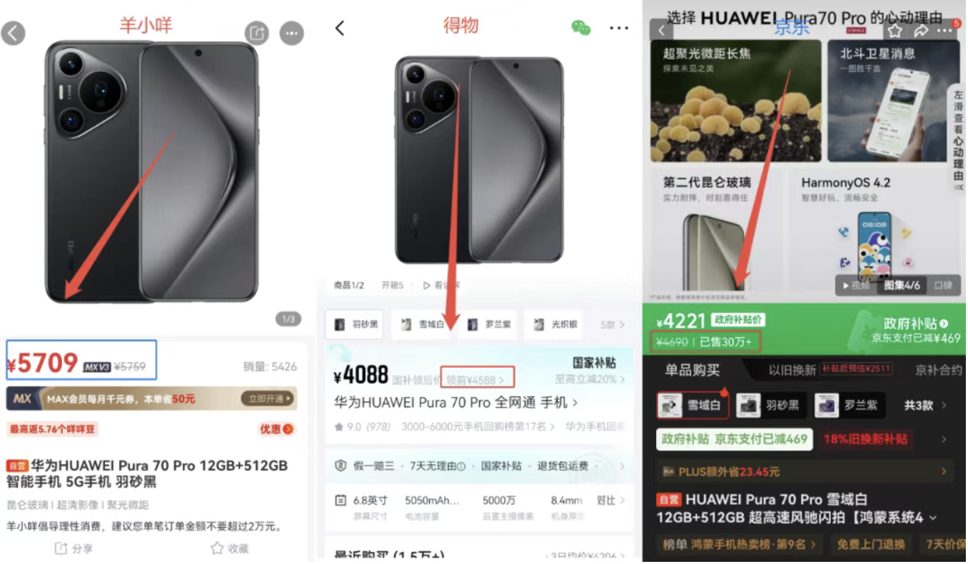 通过对比可以发现,羊小咩APP上的商品价格普遍远高于市场行情。例如,一款备注为“咩咩自营”的华为 Pura 70 Pro(12+256)手机,在羊小咩上售价为5709元,而在京东平台同样配置的手机国补前售价仅为4690元,得物国补前价格4588元,差价超过千元。这种定价策略使得量化派的毛利率高得惊人,从2023年的69.4%飙升至2024年的96.9%,这远非传统零售业务所能企及。